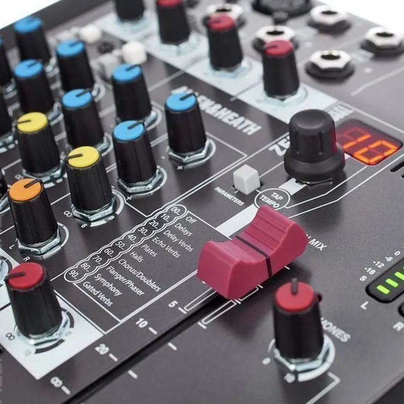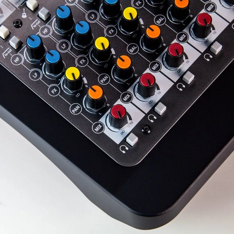 Технически каждый канал Allen & Heath ZED-6FX выполнен и спроектирован так, что каждая из четырех групп каналов выполнена на отдельной плате, а все поворотные регуляторы закреплены на передней панели стальными гайками для предотвращения повреждения от ударов. К микшеру можно подключить две гитары, таким образом, вам не нужны отдельные DI-box.