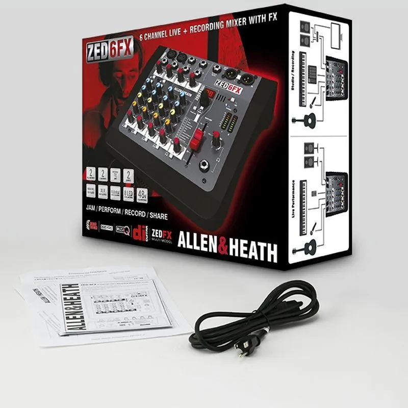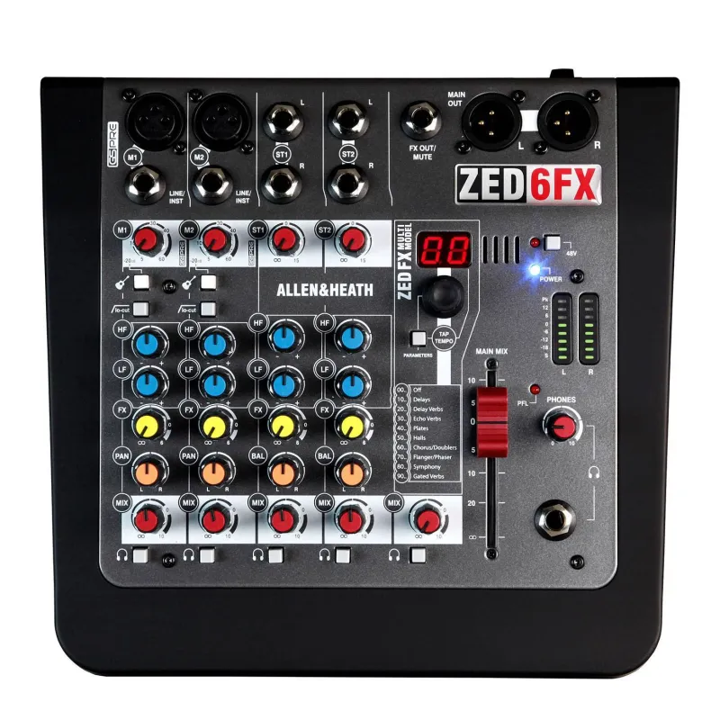 Микрофонные входы Allen & Heath ZED-6FX представлены двумя разъемами XLR, на которых также присутствуют и предусилители, созданные гуру аналогового звука Майком Гриффином. Схема аналогична используемой в студийной консоли GS-R24. Также микрофонные входы запараллелены с соответственно двумя монофоническими линейными и инструментальными входами. Это позволяет использовать на них ручки регулировки паннинга, НЧ-фильтры, двухполосные эквалайзеры и регуляторы усиления. Эквалайзер также есть и на двух стереофонических входах, где вместо регулировки паннинга и гейна вам предлагает регулировать баланс и повышать уровень выходного сигнала на +15 дБ. Кроме того, на каждом канале есть кнопка посыла сигнала в наушники. Мастер-выходы выполнены на XLR, а за уровнем звука можно следить с помощью двухполосного восьмисегментного индикатора уровня. Есть фантомное питание +48 Вольт для конденсаторных микрофонов.