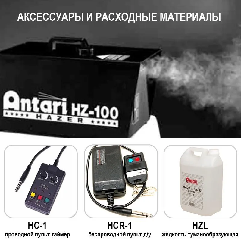 Antari HZ-100 - это прибор, создающий довольно «тонкий» эффект прозрачной «долгоживущей» дымки, которая чаще называется – туман. С одной стороны эта дымка почти не мешает видеть происходящее на сцене даже с большого расстояния, с другой стороны, свет лазеров и других световых приборов в ней прекрасно «материализуется» в объёмные фигуры.
