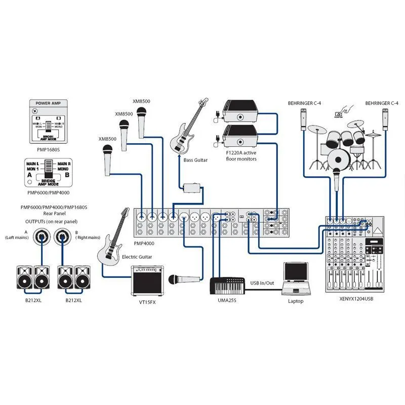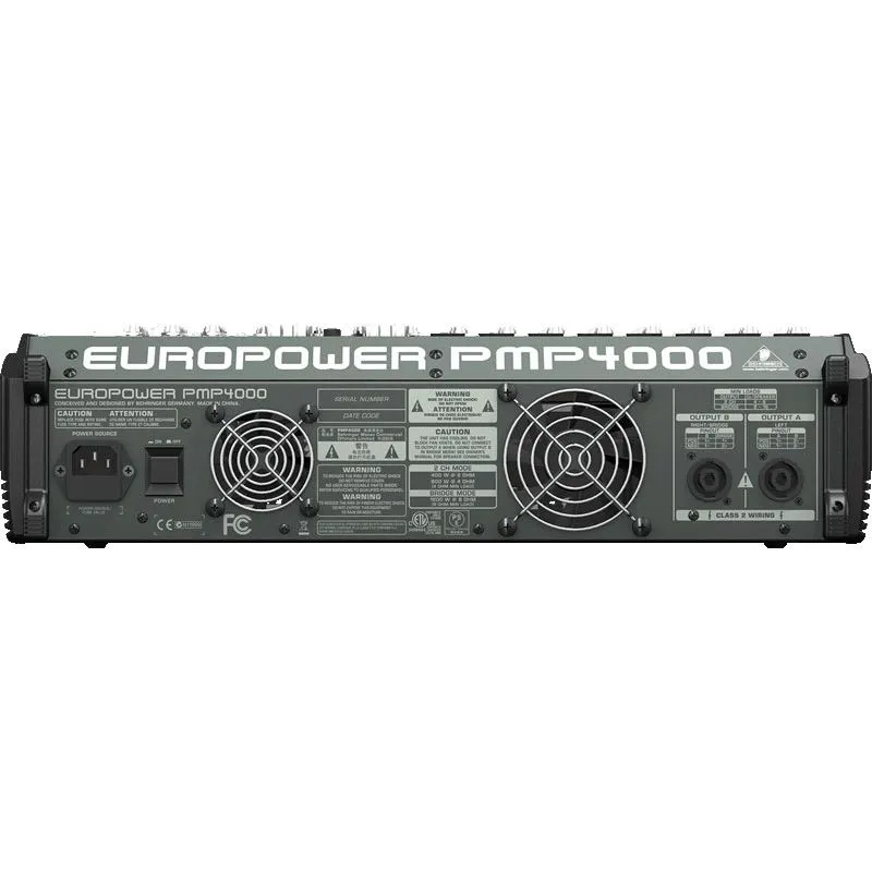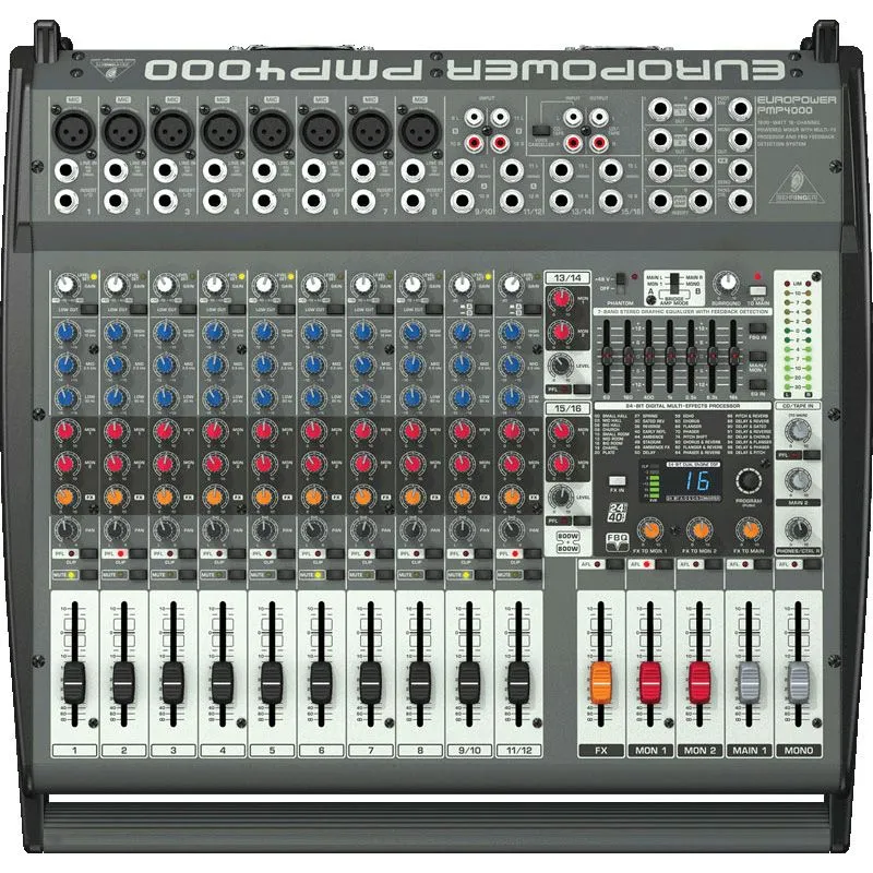 Behringer PMP 4000 EUROPOWER - микшерный пульт со встроенным усилителем мощностью 2х800 Вт ( 1600 Вт в режиме bridge), имеет 8 моновходов, 4 стереовхода, 8 микрофонных предусилителей, мастер-эквалайзер, процессор эффектов и функцию подавления вокала в фонограмме.