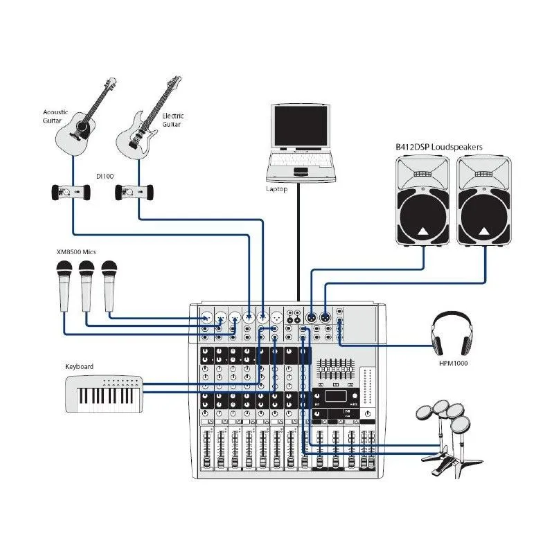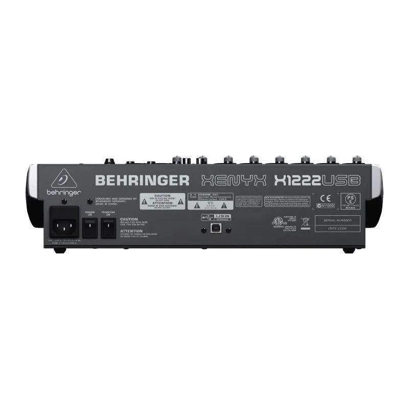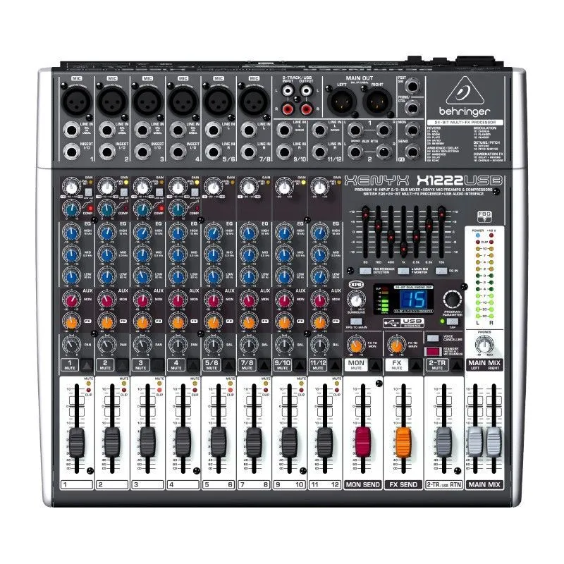 Behringer XENYX X1222USB - компактный малошумящий микшерный пульт премиум-класса, имеет 4 моновхода с независимыми компрессорами, 4 стереовхода, 6 микрофонных предусилителей, 2 шины Aux, процессор эффектов, выходной эквалайзер с детектором обратной связи, функцию подавления вокала, интегрированный USB интерфейс, встроенный импульсный блок питания.