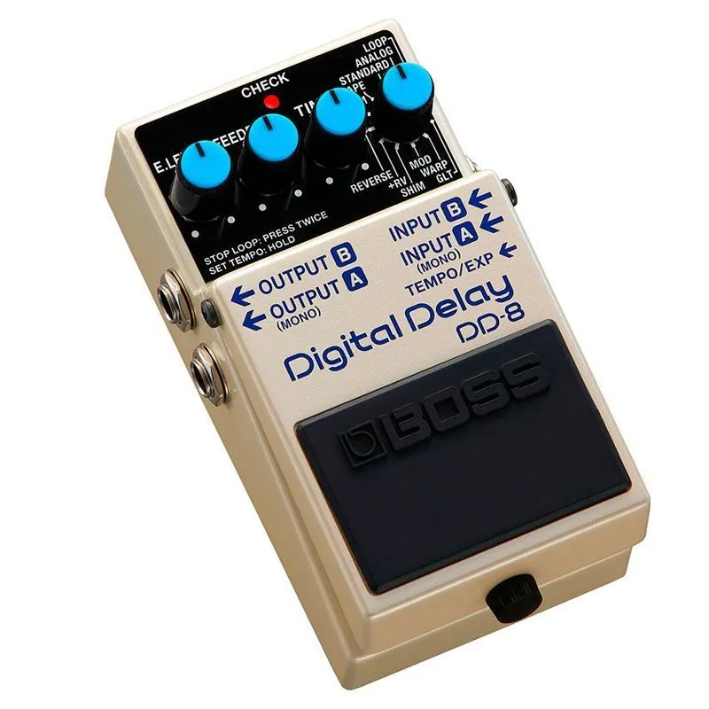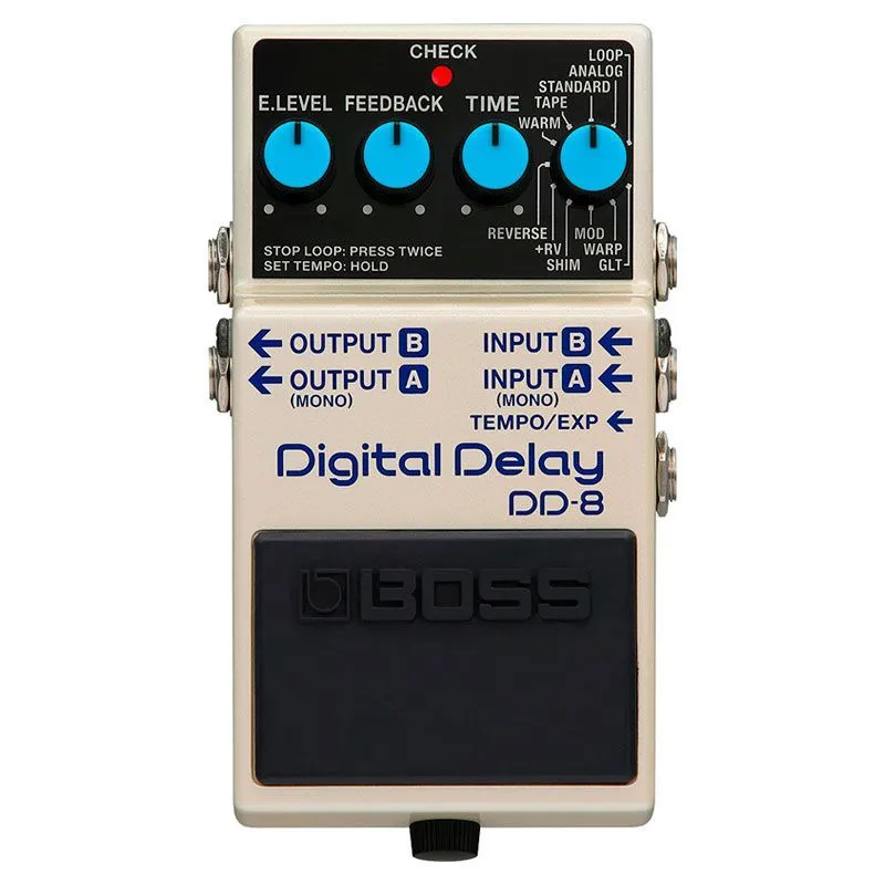 DD-8 реализует множество разновидностей эффекта задержки, позволяя с помощью одной маленькой педали получать множество выразительных звуков. Доступны чистые цифровые задержки, винтажные аналогового и магнитофонного типов, модулированное эхо, а также специального типа, такие как шиммер и реверсивная задержка. Для создания мягких тембров эха используйте задержку Warm нового типа, а для комбинирования задержки и реверберации — +RV. Warp идеально подходит для создания динамично изменяющихся пространственных текстур, а новый тип GLT — "сумасшедших" ритмических эффектов.