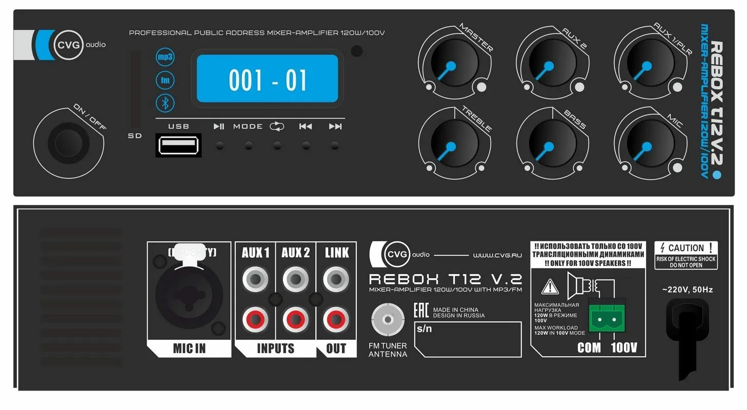 CVGaudio ReBox-T12 – миниатюрный профессиональный микшер-усилитель с встроенным MP3 / FM / Bluetooth модулем для систем трансляции фоновой музыки и речевого оповещения. Благодаря своему миниатюрному размеру и продуманной эргономике данный усилитель является уникальным в своем формате устройством. Он может использоваться как настольное устройство или устанавливаться на стену с помощью кронштейнов, входящих в комплект поставки усилителя.