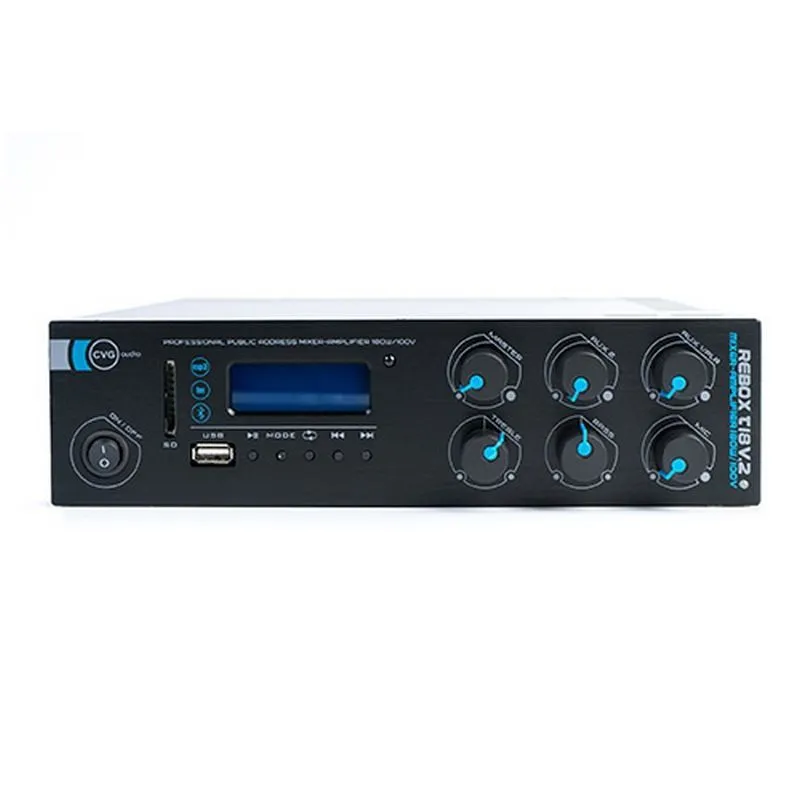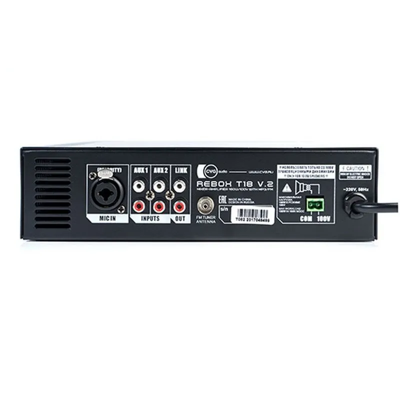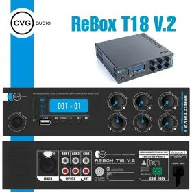 CVGaudio ReBox-T18 V.2 – миниатюрный профессиональный микшер-усилитель с встроенным MP3 / FM / Bluetooth модулем для систем трансляции фоновой музыки и речевого оповещения.