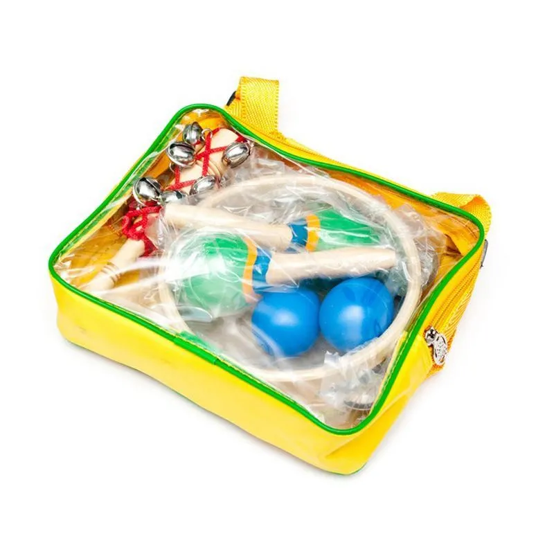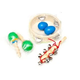 Набор перкуссии для детей. В набор входит: бубен, шейкеры, маракасы и колокольчики.