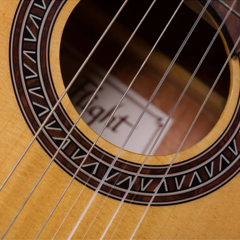 Оригинальный графический рисунок на розетке сразу привлекает внимание и отлично гармонирует с подставкой и черной окантовкой на нижней и верхней деках инструмента. FLIGHT C-120 выполнен в натуральном цвете с классической глянцевой отделкой.