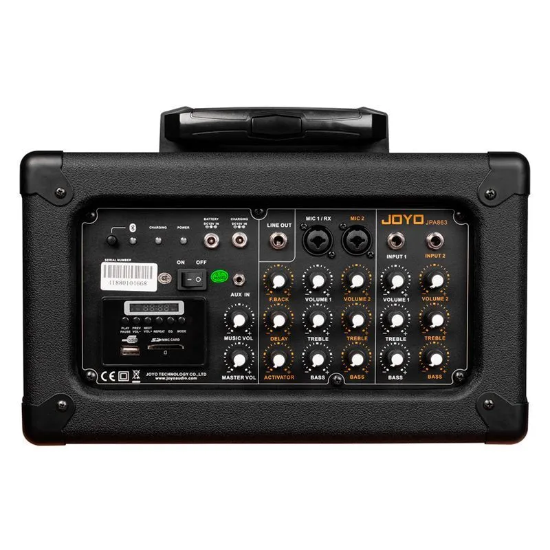 JOYO JPA-863 переносная, мобильная акустическая система, с возможностями работы от аккумулятора, беспроводного подключения и нескольких входов: есть выделенные 2 входа для гитары и 2 входа для микрофона с комбинированными разъемами XLR / jack.