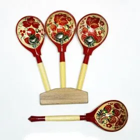 Ложки расписаны Хохломской и Городецкой росписью на предприятиях нижегородских художественных промыслов.