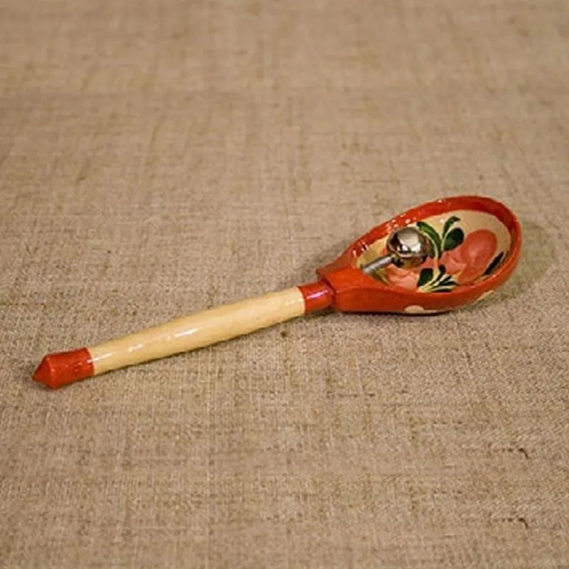 Ложка выполнена на станке. Черенок и черпак соединяются клеем. С внутренней стороны черпака крепится бубенчик.
