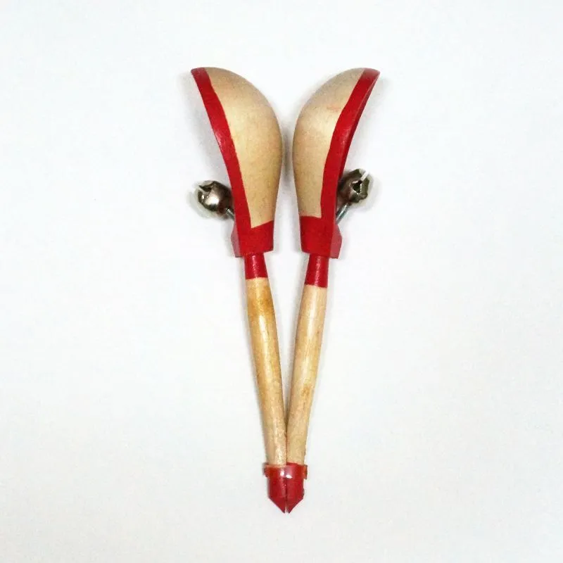 Ложки в станке с бубенцами (к2-лж-05) 2 категории представляют собой две деревянные ложки, соединенные вместе с помощью хлорвинилового кольца диаметром 20 мм. Хвостовики черенков сточены под углом в 45 градусов. В задней части черенков вмонтирован скрытый шип. В каждый из черпаков с наружной стороны вклеено по одному бубенчику.