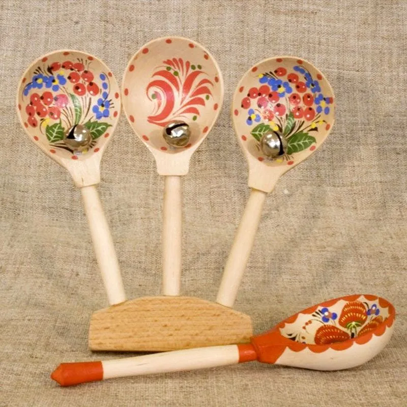 Кто и когда первый додумался превратить наши обыкновенные столовые ложки в ударный инструмент, сказать теперь совершенно невозможно. Но то, что это и прежде и теперь самый простой, самый колоритный и распространенный инструмент русского народа, - бесспорный факт. Наши расписные деревянные ложки популярны не только у нас, но и за рубежом. Тысячами вывозят их иностранцы к себе домой в качестве сувениров. Еще бы: легко, красиво, дешево и сразу "два зайца" - старинный предмет быта и он же - музыкальный инструмент. Деревянные ложки и половники можно купить в магазинах, на базарах или вырезать из сухого дерева самим. Есть народные мастера, специализирующиеся на изготовлении именно музыкальных ложек. Их изделия отличаются несколько большей толщиной, а значит, прочностью и большей звучностью; они используют лучшие породы древесины. Некоторые исполнители навешивают на ложки бубенчики, украшающие цокающий перестук дополнительным звоном.
