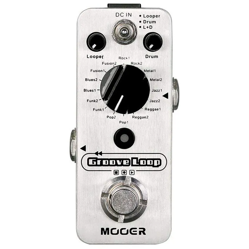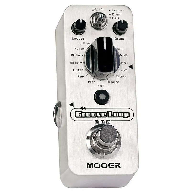 Mooer Groove Loop - это компактная педаль, которая объединяет в себе лупер Micro Looper и драм-машину Micro Drummer в одной микро педали - идеальный портативный компаньон для джемминга. Каждый из элементов можно использовать как индивидуально, так и одновременно. При одновременном использовании лупер автоматически синхронизируется с выбранной барабанной партией, а вступительный затактовый метроном поможет начать запись вовремя. Кнопка Tap Tempo позволяет легко настроить темп барабанной партии, а независимые регуляторы уровнем плейбэка для драм-машины и и лупера дают возможность легко выставить правильный баланс.