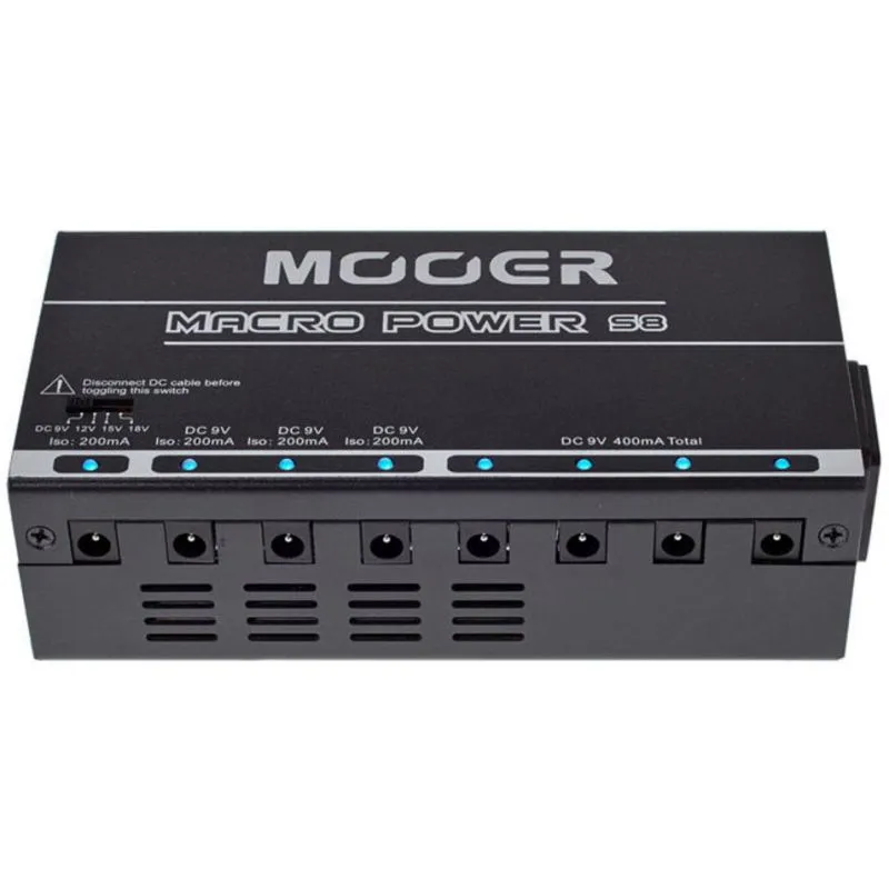 Mooer Macro Power Power S8 - это блок питания для гитарных педалей, оснащенный 8-ю независимыми выходными гнездами, переключаемым выходным / входным напряжением и защитой от перегрузки.