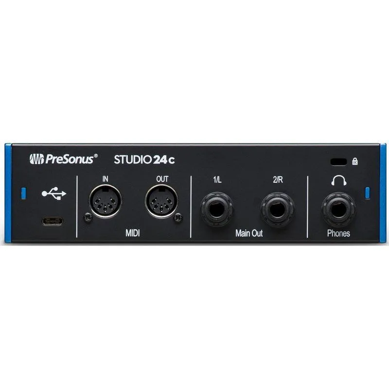 Аудио интерфейс Studio 24C 2х2 оснащен комбинированными микрофонными / инструментальными / линейными входами с фантомным питанием + 48 В для конденсаторных микрофонов; балансными 1/4-дюймовыми TRS линейного уровня основными выходами, портом USB-C, выходом для наушников, регулятором выходного уровня и регулятором Mixer, объединяющим в себе аналоговый вход и компьютерное воспроизведение для прямого мониторинга с низкой задержкой. Наличие встроенного MIDI интерфейса позволяет подключать сопутствующее MIDI оборудование, такое как: клавишные, звуковые модули или control surface.