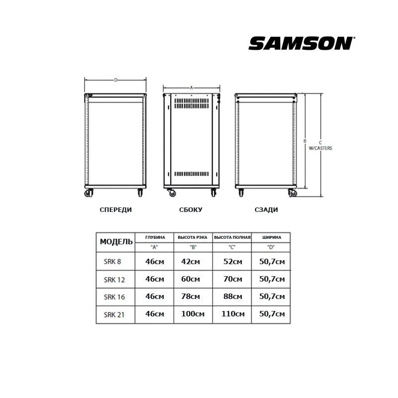 SAMSON SRK16 - прочный стальной рэк с полностью закрытыми боковыми панелями, мощными 75 мм ножками-колесиками с блокировкой и отверстиями на боковых панелях.
