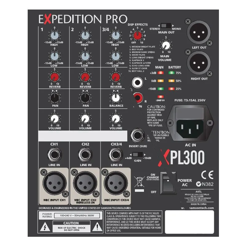 XPL300 - это активная акустическая система со встроенным 4-канальным стереомикшером и 24-битным процессором эффектов. В качестве динамиков используются 12" низкочастотный драйвер с 1.5" звуковой катушкой и 1.5" высокочастотный титановый компрессионный драйвер. Встроенный микшер имеет 2-полосный эквалайзер, 2 микрофонных/линейных канала и стереоканал с микрофонным предусилителем. RCA разъемы также позволяют быстро подключать различные внешние устройства. Секция цифрового процессора содержит 10 высококачественных пресетов, обеспечивающих гибкость при поиске идеального звука. XPL300 имеет усилитель класса D, способный воспроизводить звук мощностью до 200 Вт RMS. Также имеется встроенный порт для iPod. Samson XPL300 рекомендуют профессионалы со всего мира.