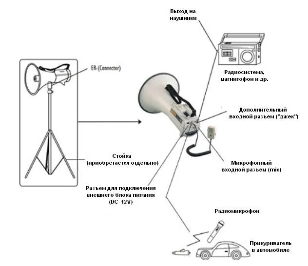 Тип: Рупорный громкоговоритель (мегафон) с выносным микрофоном и режимом "сирена".