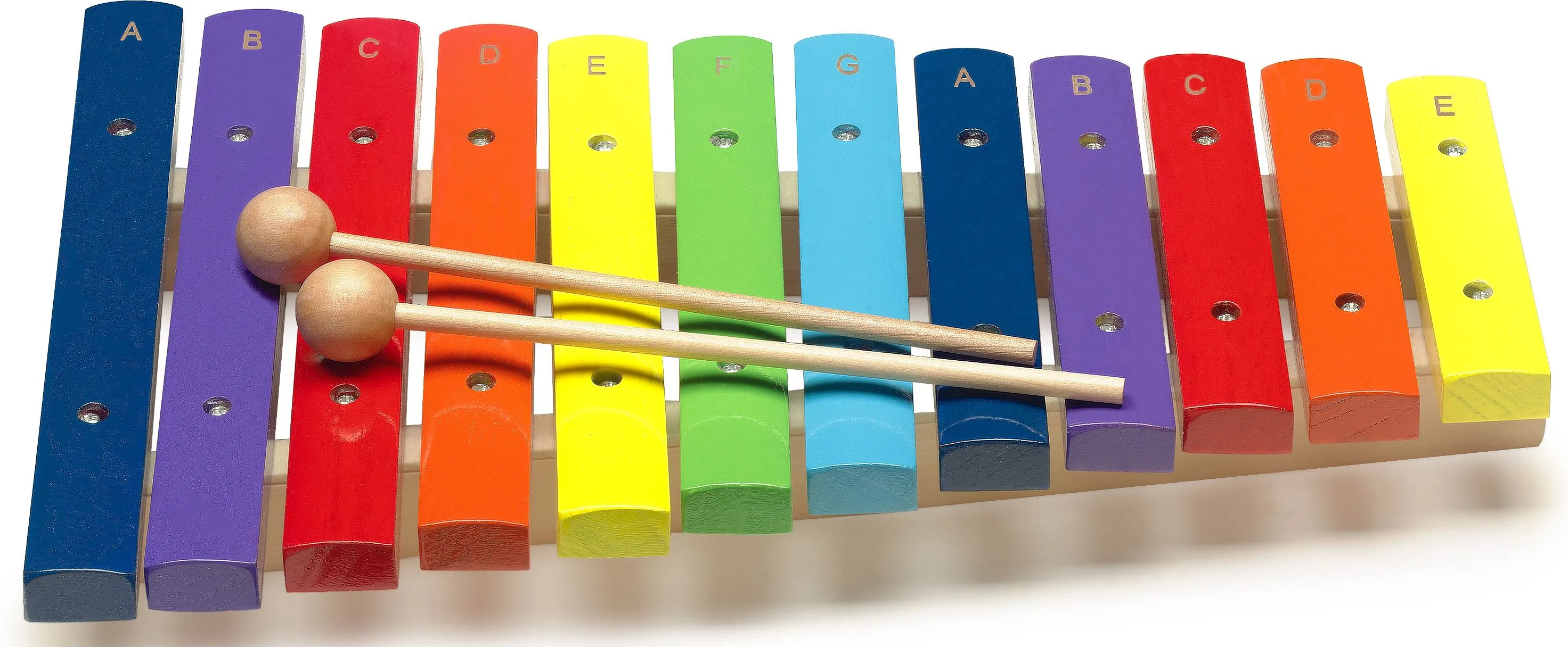 Ксилофон с 12 разноцветными клавишами (нотами) и двумя деревянными молоточками