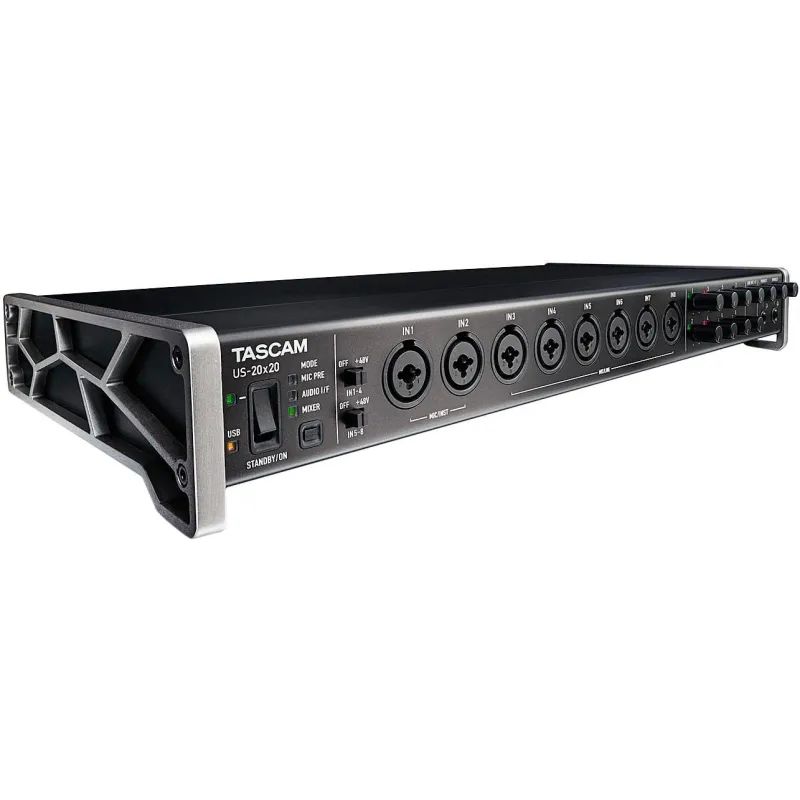 Tascam US-20×20 — 20-канальный звуковой интерфейс для шины USB 3.0. Данный продукт является флагманской моделью в своей линейке и предназначен для использования в профессиональных студиях. Устройство поддерживает частоты дискретизации до 192 кГц при подключении к порту USB 3.0 и может работать в нескольких режимах, что делает её весьма универсальным устройством, в том числе для многоканальной записи.