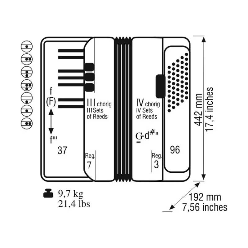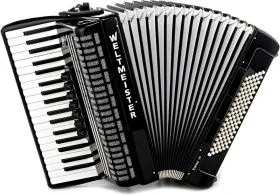 WELTMEISTER Topas III - представляет собой трехголосный аккордеон с диапазоном звучания от «Фа» малой октавы до «Фа» третьей октавы и готовым встроенным аккомпанементом.