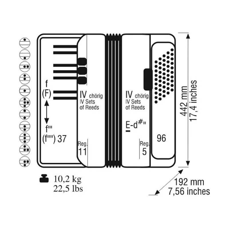 WELTMEISTER Topas IV - Профессиональная модель аккордеона, которая подойдет как для обучения в школе или училище, так и для выступления на сцене. Диапазон звучания мелодии от “Фа” малой октавы до “Фа” 4-й октавы, аккомпанемента от “Ми” большой октавы до “Ре-диез” 2-й октавы.