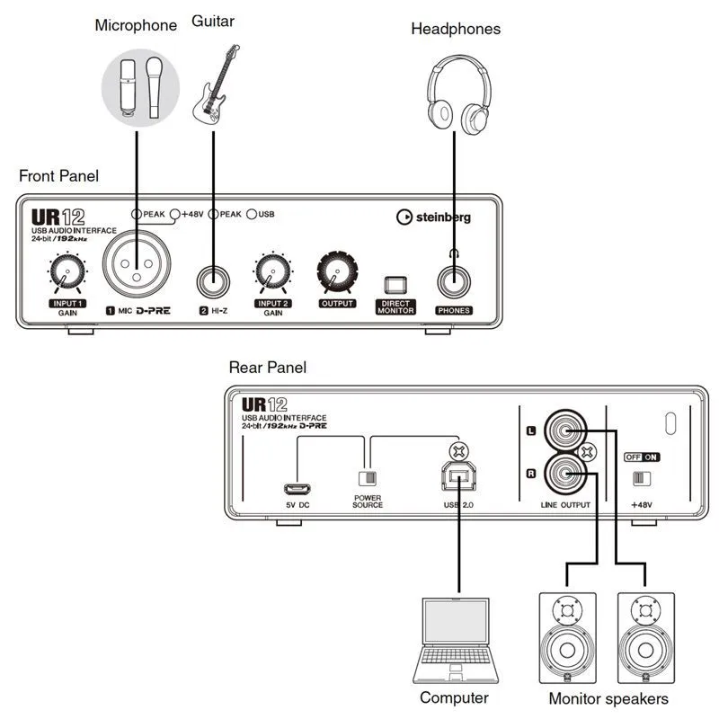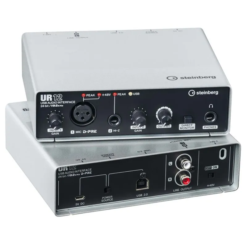 Steinberg UR12 – это профессиональный USB- аудиоинтерфейс 2-in x 2-out с поддержкой 24бит/192кГц и технологии D-PRE от компании YAMAHA