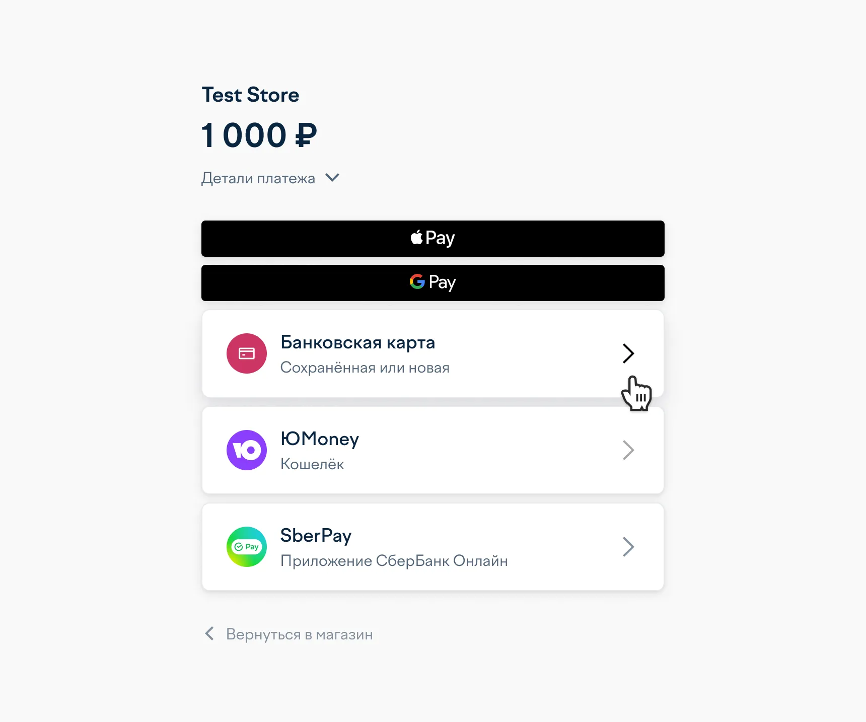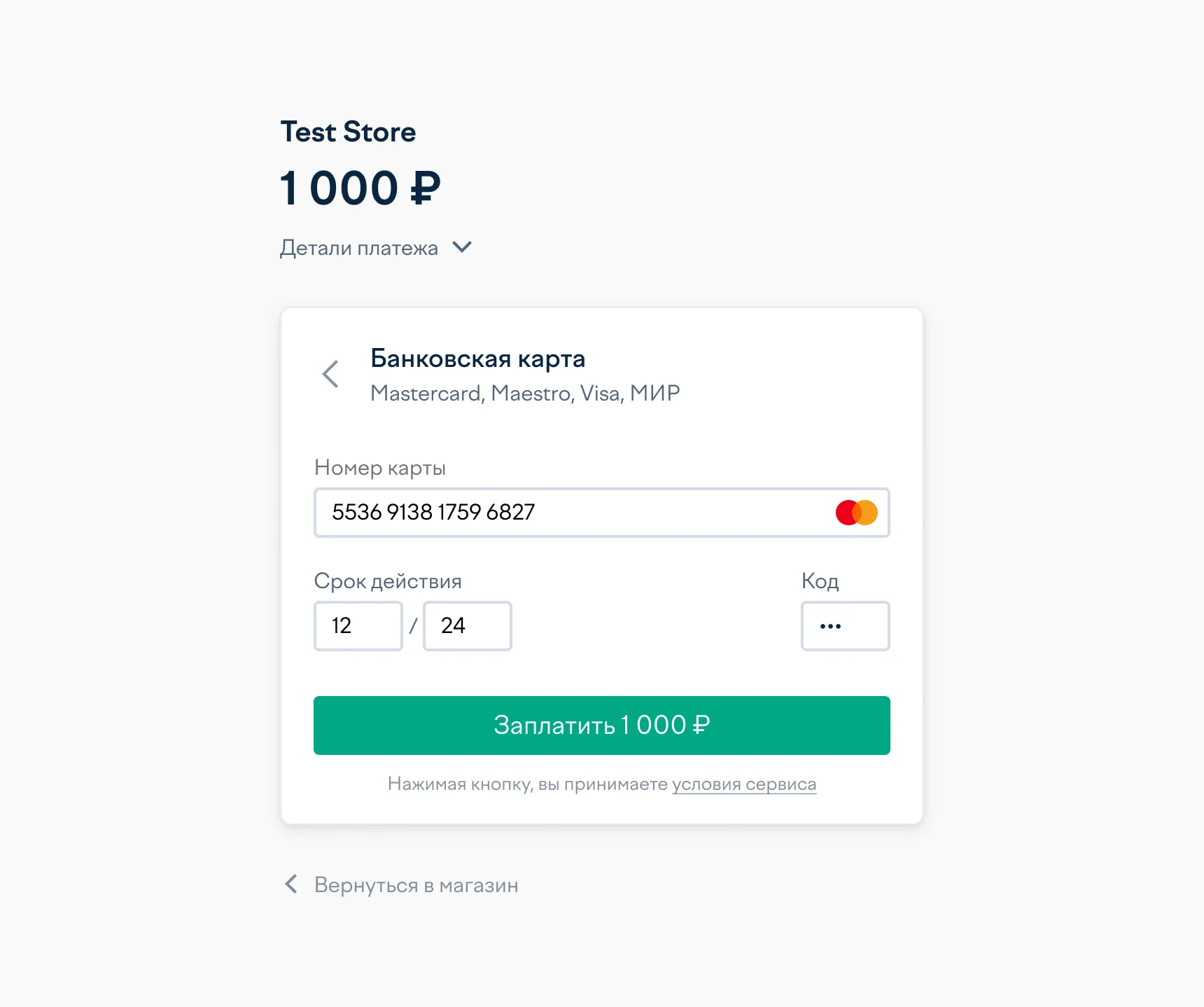 - Готово. Платёж прошёл, вы можете вернуться на сайт, где начинали платить, по кнопке Вернуться в магазин внизу страницы.
